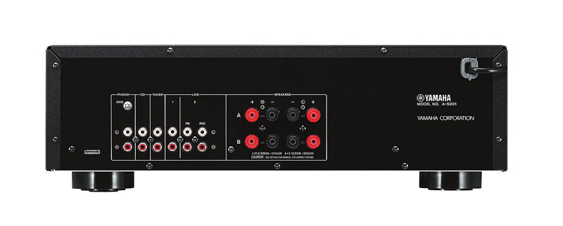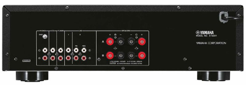 A-S201有一个动磁式唱机输入端子用于连接唱片播放器。共有五个输入端子能用于不同类型音频系统的中间处理单元。大型螺旋式扬声器端子与厚实的扬声器电缆牢固连接。