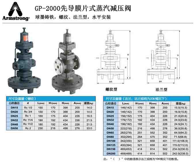阿姆斯壮GP-2000先导膜片式蒸汽减压阀的技术参数:
